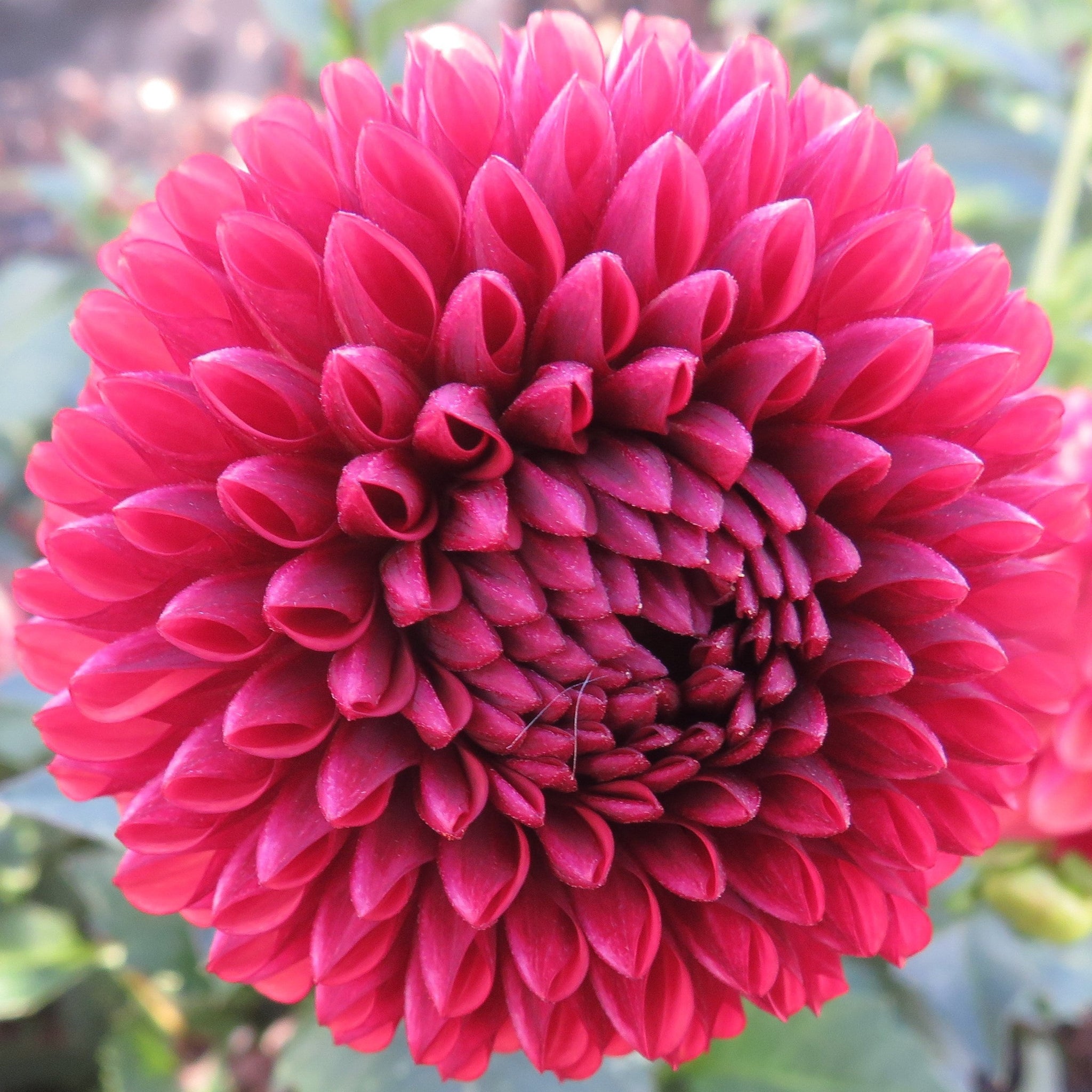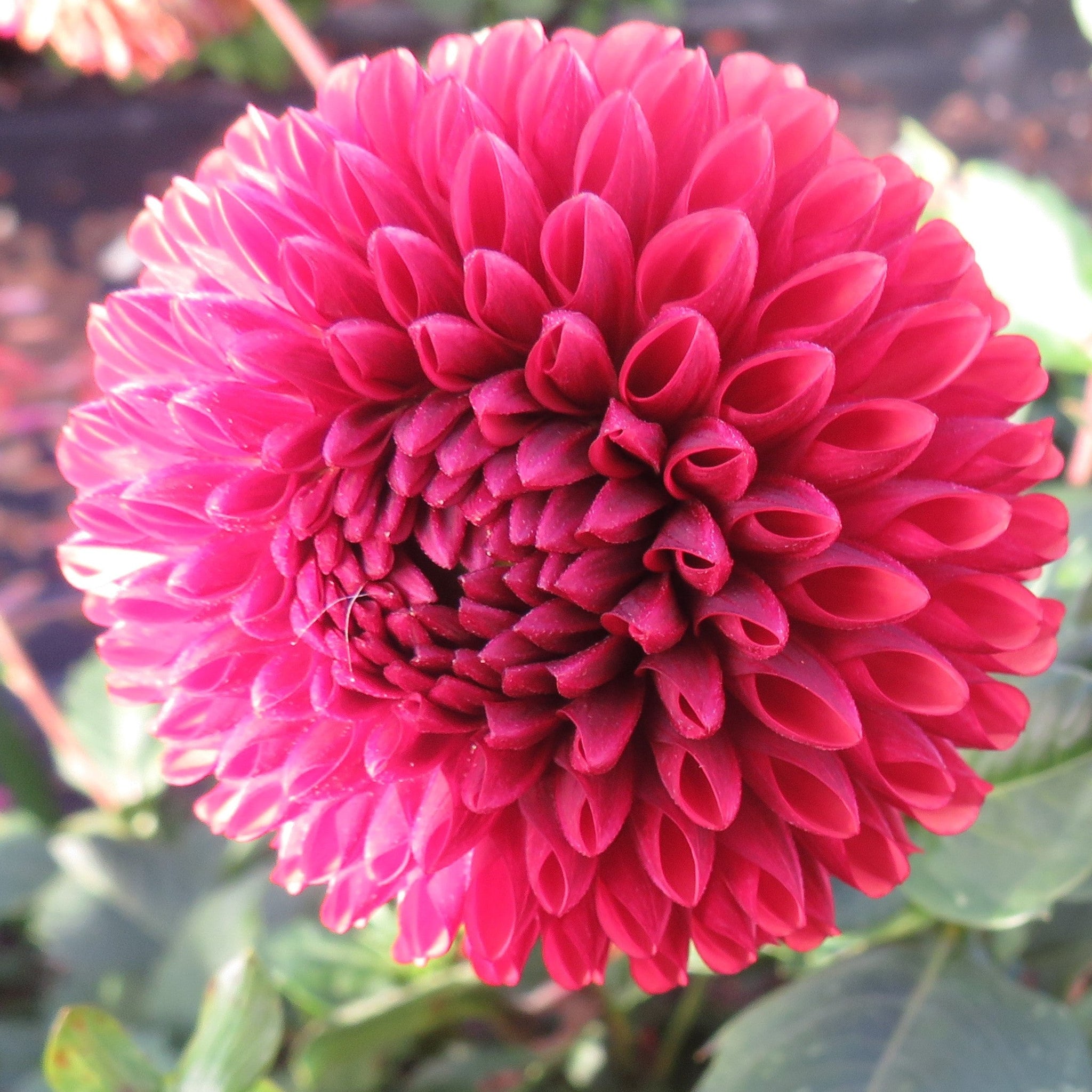 Raspberry bronze colored ball dahlia. Beautiful blooms that last until frost.